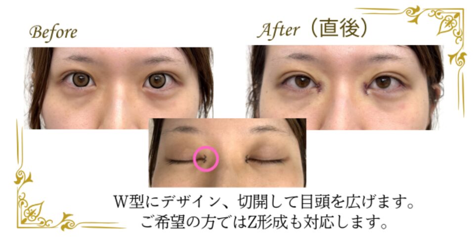 W法は、目頭の皮膚をW型に切開して皮膚を切除し、Wの中央部分の皮膚を目頭の奥に差し込むようにする方法。従来のただ切り取るだけの方法より、ヒキつれや術後元に戻ってしまうリスクなどが改善された術式です。
